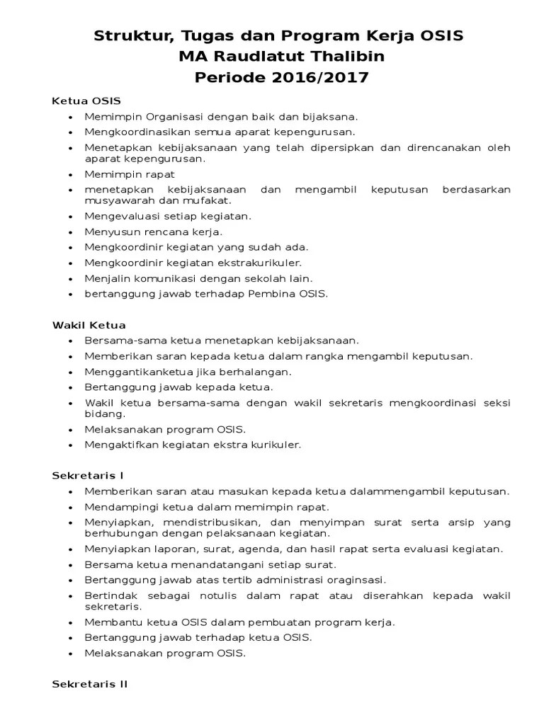 Program kerja osis merupakan suatu uraian yang terdiri dari berbagai macam kegiatan osis yang akan dilaksanakan oleh para pengurus osis dan . ٢٠ ذو الحجة ١٤٤٣ هـ. 2) menyiapkan laporan, hasil rapat,dan evaluasi kegiatan.